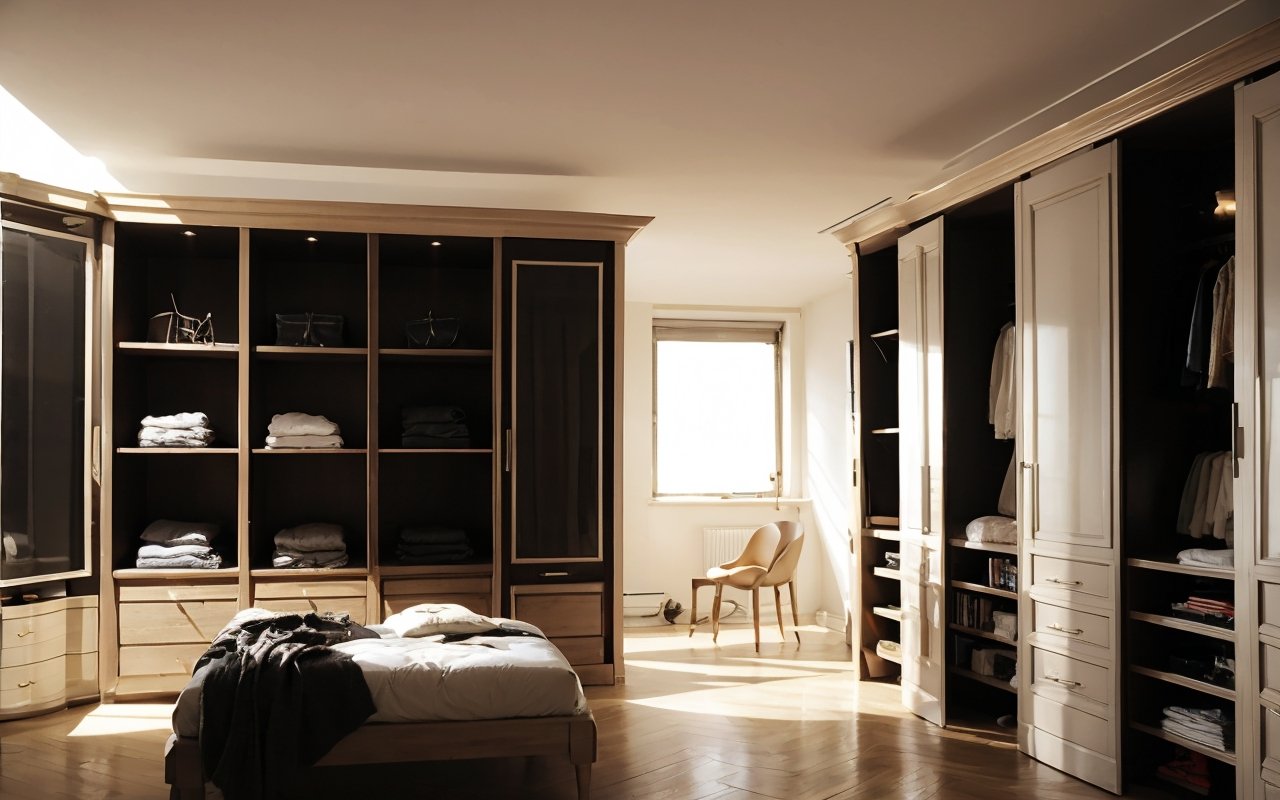- Визуальное расширение пространства: Светлые цвета отражают свет, что помогает визуально увеличить пространство. Если ваша гардеробная небольшая, это отличный выбор.