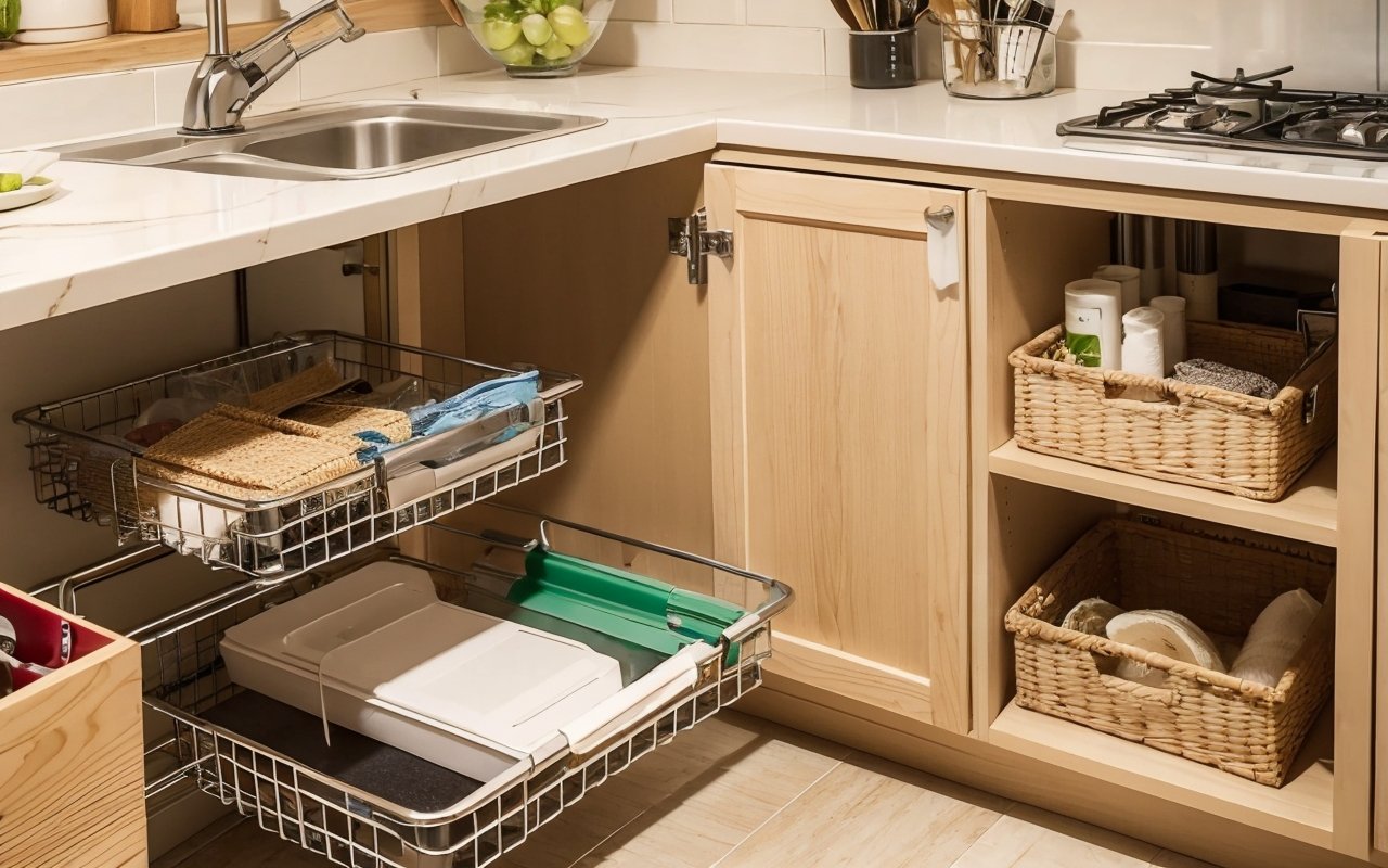 Для оптимизации уголков и труднодоступных мест можно использовать вращающиеся полки или корзины на выдвижных механизмах. Эти устройства позволяют легко добираться до предметов, которые обычно теряются на задних планках шкафов.