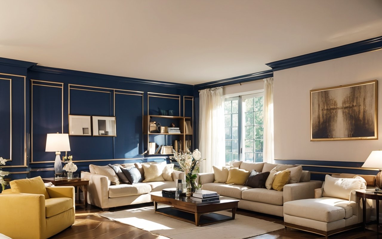 Такое сочетание создаёт ощущение спокойствия и прохлады. Темно-синий диван будет отлично выделяться на фоне светло-голубых стен, создавая уютный морской стиль.