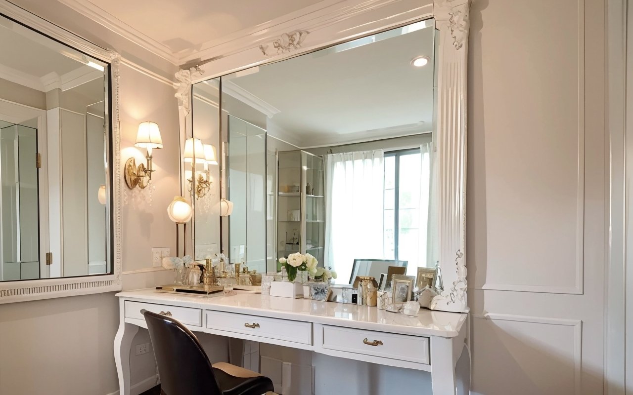 - Используйте рамки или декор, чтобы разбавить зеркальную гладкость — это поможет уменьшить ощущение «стены-ловушки».